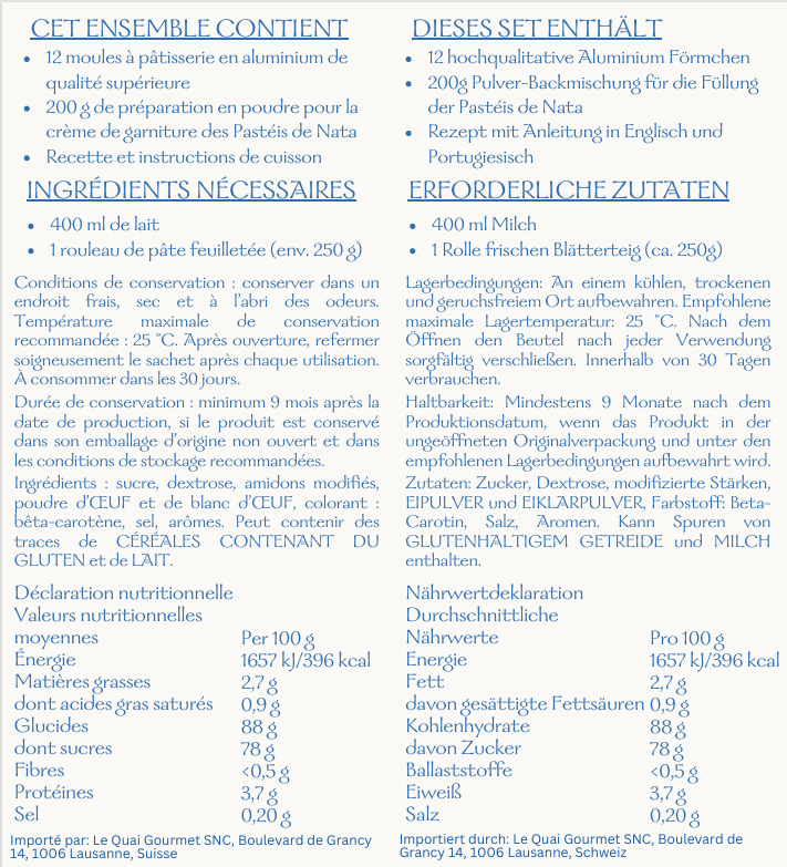 - 200g de préparation en poudre pour la crème de garniture des Pastéis de Nata (Baking Kit)